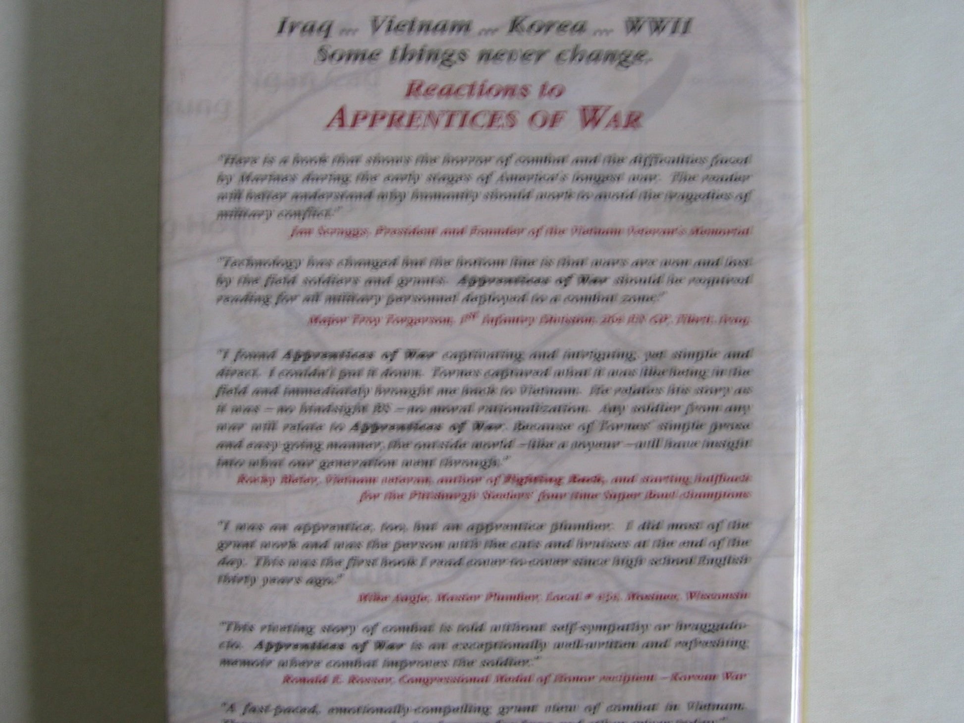 Iraq,Vietnam, Korea or WW II: it makes no difference...they are the apprentices of wars; young grunts who do most of the fighting and dying. Their apprenticeships are short and violent. Survival often depends more upon luck than training or experience. It's an environment where peer pressure creates heroes. Those who survive are often better people for it. They move forward with their lives possessing the unique self-confidence that only combat survival produces.